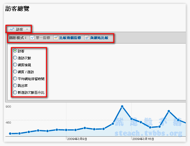 就像下圖,點擊訪客有下拉式選單,可以選擇數據的曲線圖,還可以做比較,讓你清楚的知道差異性在哪裡。