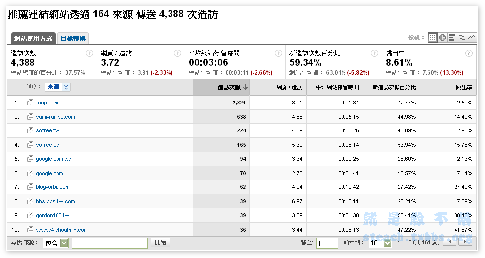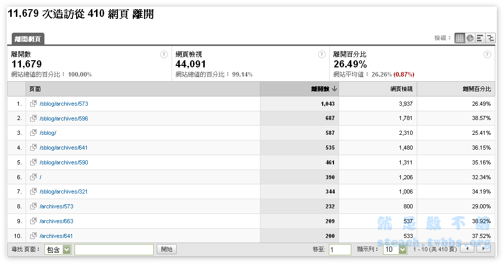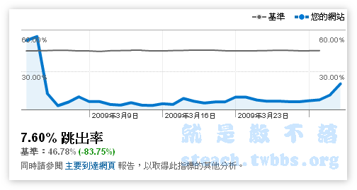 - 跳出率(Bounce Rate ):接續著上面二個數據,而產生直接關係的就是這個BR值了,所謂的BR值意謂〝進來網站即離開的訪客〞,也就是可能是從某個網站點了連結進來後就離開的訪客,原則上就是進來網站後只看了連結進來的當頁面即離開,此BR值愈高,表示連結進來的訪客對於你網站的其它文章興趣缺缺,因此綜合了AP值、TS值、BR值、如果都偏低的話,千萬不要再執著於人氣上,而是要趕緊的好好充實網站的內容,否則就是一個人人經過卻都沒興趣進去的景點哦!