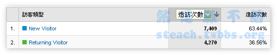 這項數據對一個網站有一定的重要性,站長認為能維持在50%對50%是再好不過,表示你的網站有著固定的粉絲,且不斷一直能有新訪客的到來,這對網站人氣持續成長有一定的關鍵性哦!要不斷的吸引新的訪客以及留住固定的粉絲群,只能靠各位站長大哥不斷努力的推廣自己和寫好文囉!