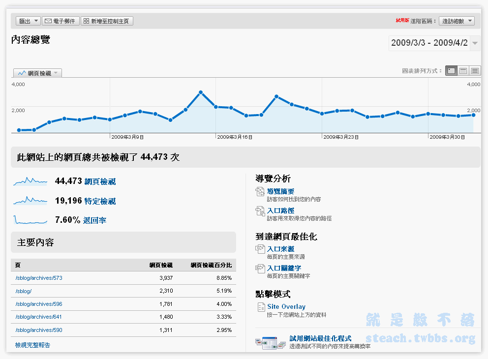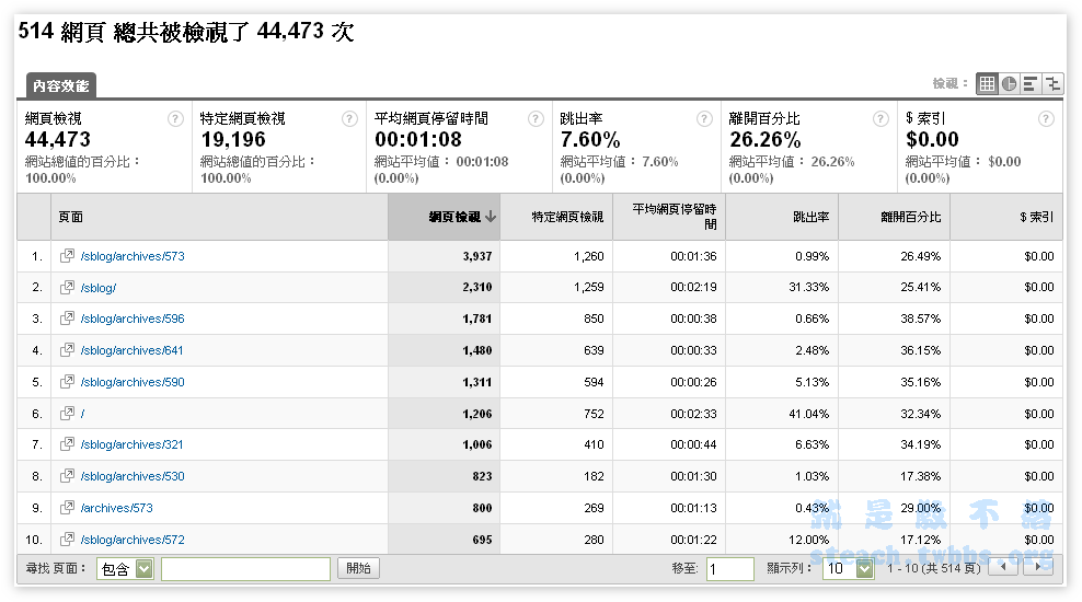 ※此教學共分為3頁,請點選以下連結繼續觀看: 1、訪客(Visitors)數據解析 2、流量來源(Traffic Sources)數據解析(本頁面) 3、內容(Content)數據解析三、內容(Content): 不管你是入口網站,部落格,論壇,通通都是要靠一篇篇文章來構成,而這內容的統計數據,可以讓你了解到你的粉絲都愛看你哪些文章,或者你的哪些文章較深受訪客的喜愛,比如說站長前2天發了有關Google Analytics的服務申請或是像部落格軌道的介紹,都深受不少人的喜愛,那麼你就可以針對這些訪客再多深入寫一些相關的文章哦!算是回饋這些在背後默默支持你的粉絲囉! 1.總覽: 相當然爾,我們一樣先來看一下內容的統計數據總括頁面,接下來我們一樣往下來看,一一細項解說吧。