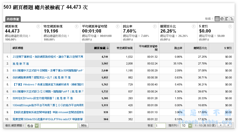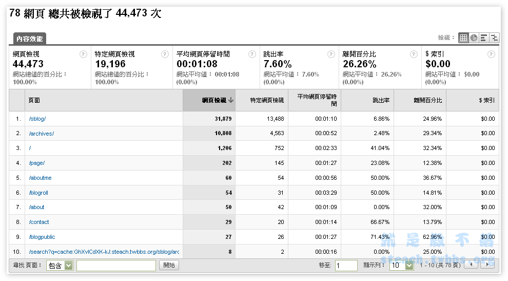 這部份所計算的數據為你的網站網頁網址被瀏覽的次數,比如說你的部落格中有特別為專屬某一內容所寫的分頁,那麼該分頁的網址,可能就會集中一定的瀏覽次數哦。