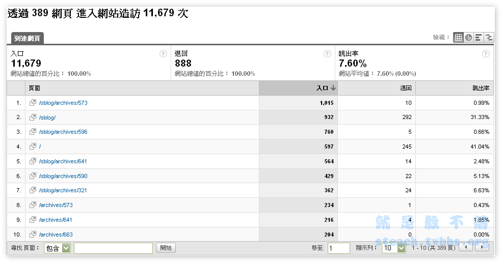 也就是你的訪客是從哪一個頁面進入到網站,例如從別人轉頁來的連結有可能不是首頁,所以有可能一進來就落在某篇文章中,也就是說此項數據為訪客進入到你的網站第一個頁面的統計。