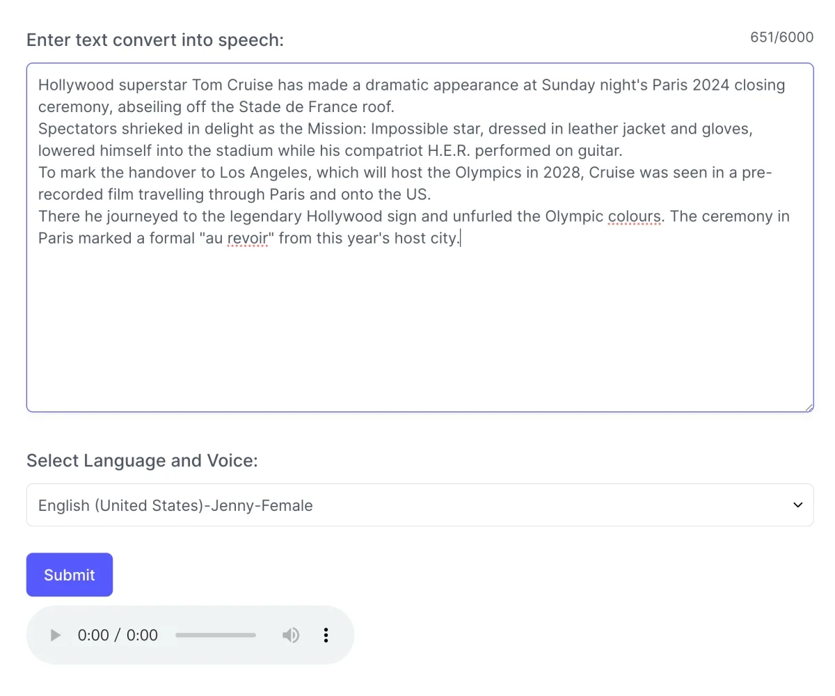 目前最多可以輸入 6000 個字元,我自己試下來,中文真的已經蠻自然,而英文的部份更是聽不出有什麼問題,貼上要轉換的內容,再選擇要使用的語言再送出。