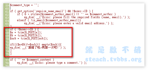 if ( !$user->ID ) { $a = trim($_POST[a]); $b = trim($_POST[b]); $sub = trim($_POST[sub]); if((($a+$b)!=$sub)|| empty($sub)){ wp_die( __('算錯了吼~再算一次吧!') ); } }插入位置可參考下圖(這段語法是用來定義計算式,不只加法,減乘除都能改)