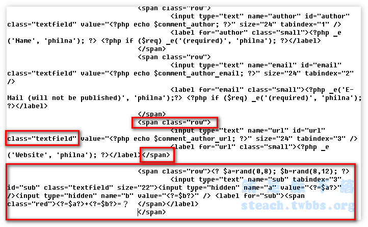 <p><? $a=rand(0,10); $b=rand(0,10); ?> <input type="text" name="sub" tabindex="3" id="sub" size="22"><input type="hidden" name="a" value="<?=$a?>" /><input type="hidden" name="b" value="<?=$b?>" /> <label for="sub"><span class="red"><?=$a?>+<?=$b?>=?</span>(必填)</label></p>※如果你的comments有像下圖一樣用到<span class=”xx “>則將<p>取代為你comments 裡的<span=”xx “>,而在宣告表格的語法裡如有用到像下圖 class=” xx“,則可以在語法 中加入,例如修改後如下,這樣就會和你佈景的表格一模一樣囉!