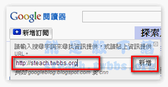 在左上角一個新增訂閱的按鈕,如果你找不到對方的RSS網址沒關係,很簡單,只要直接輸入對方的部落格網址,Google大神會自己幫你抓啦。