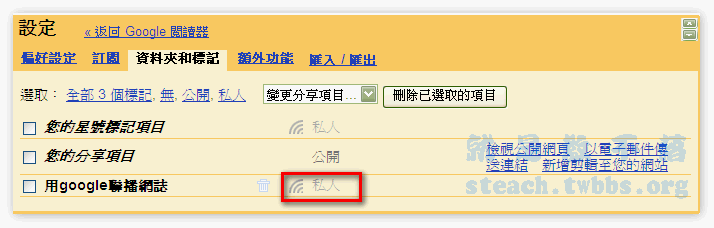 接下來到〝資料夾和標記〞裡找到剛剛新增的資料夾(如果沒看到重新整理就有了),你會發現是私人狀態~點他一下就變成公開囉(要聯播給人看當然是公開)