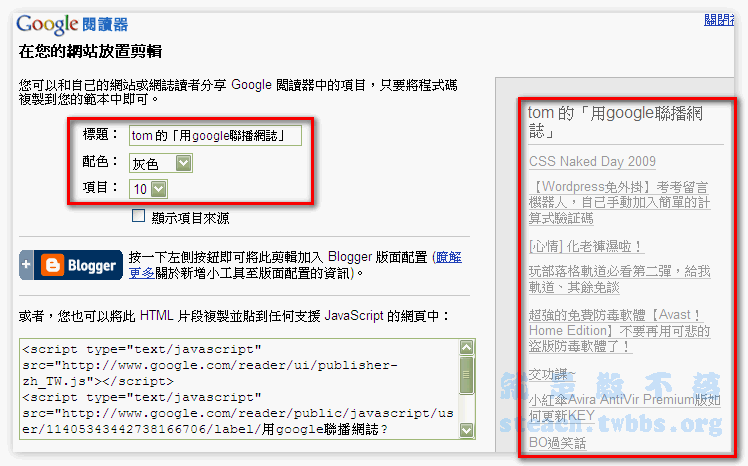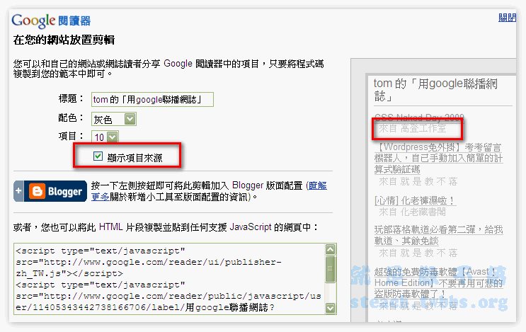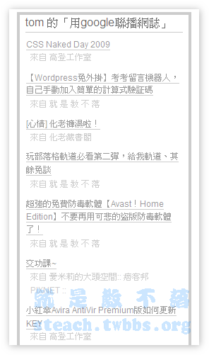 聯播為了的效果主要當然是互相宣傳部落格,所以此時我們就可以把〝顯示項目來源〞勾選起來,就會一併顯示部落格名稱囉,如此一來就製作完成囉~