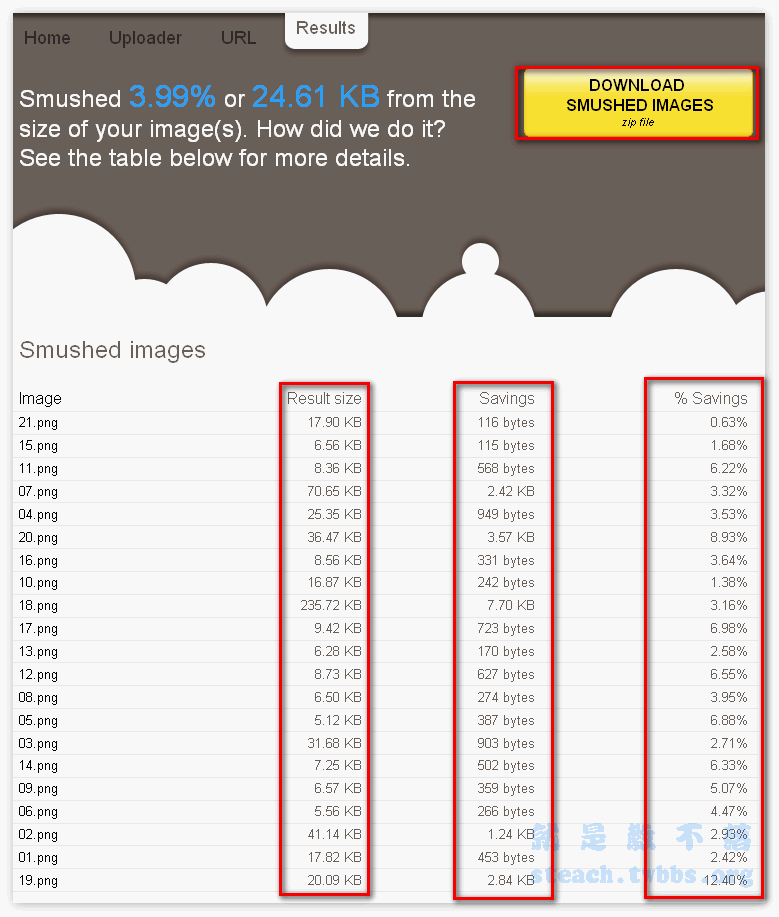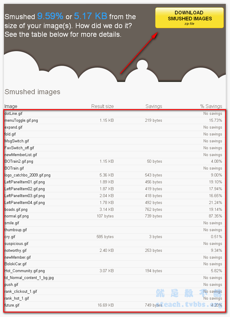 身了多少大小,瘦身比率多少,讓你一目了然,接下來我們只要點擊右上角的〝DOWNLOAD SMUSHED IMAGES〞就能下載已經打包好的全部圖片囉~