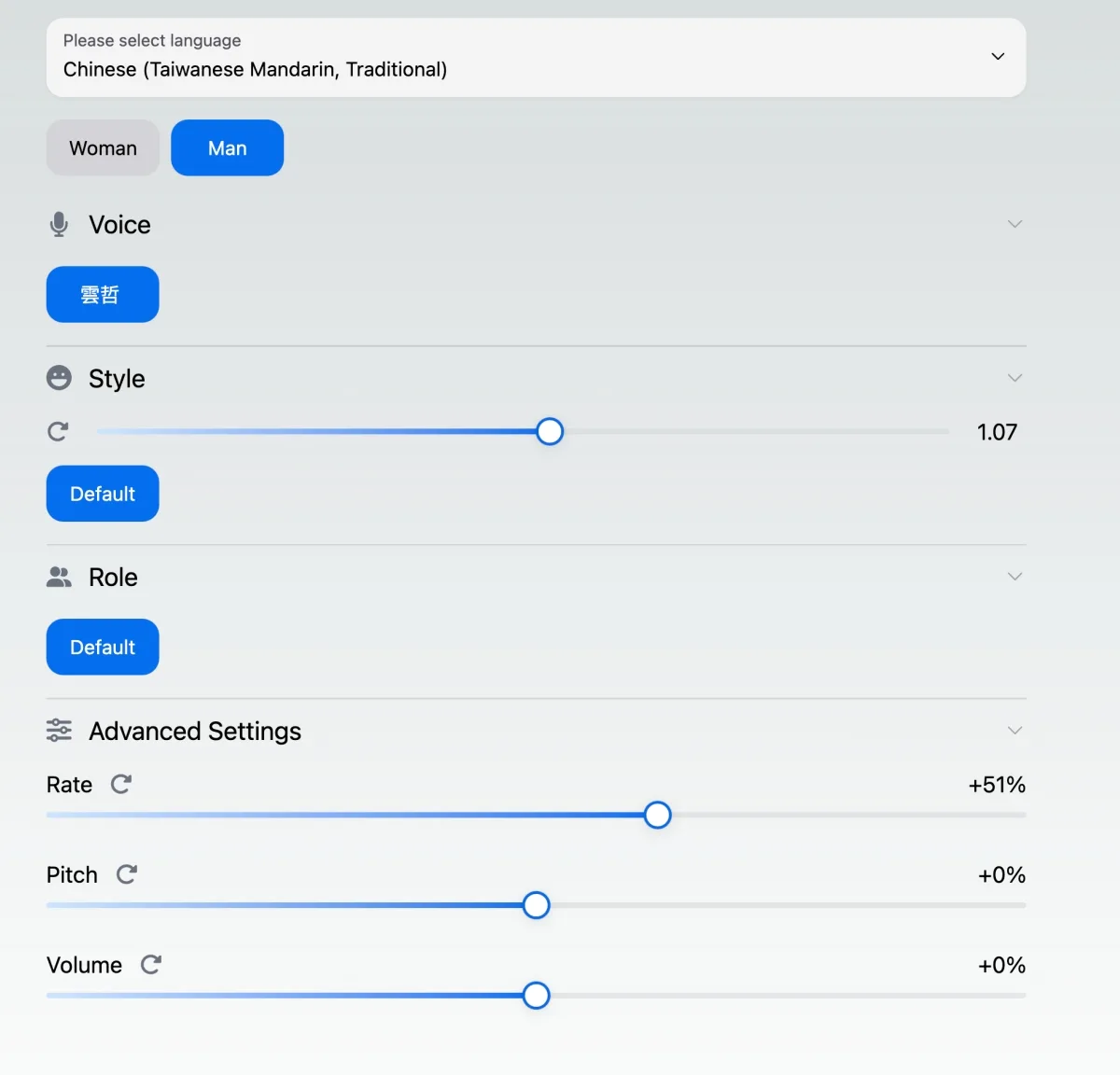中文只有男女且加起來只有三個聲優,往下還可以調整語速、語調等設定。