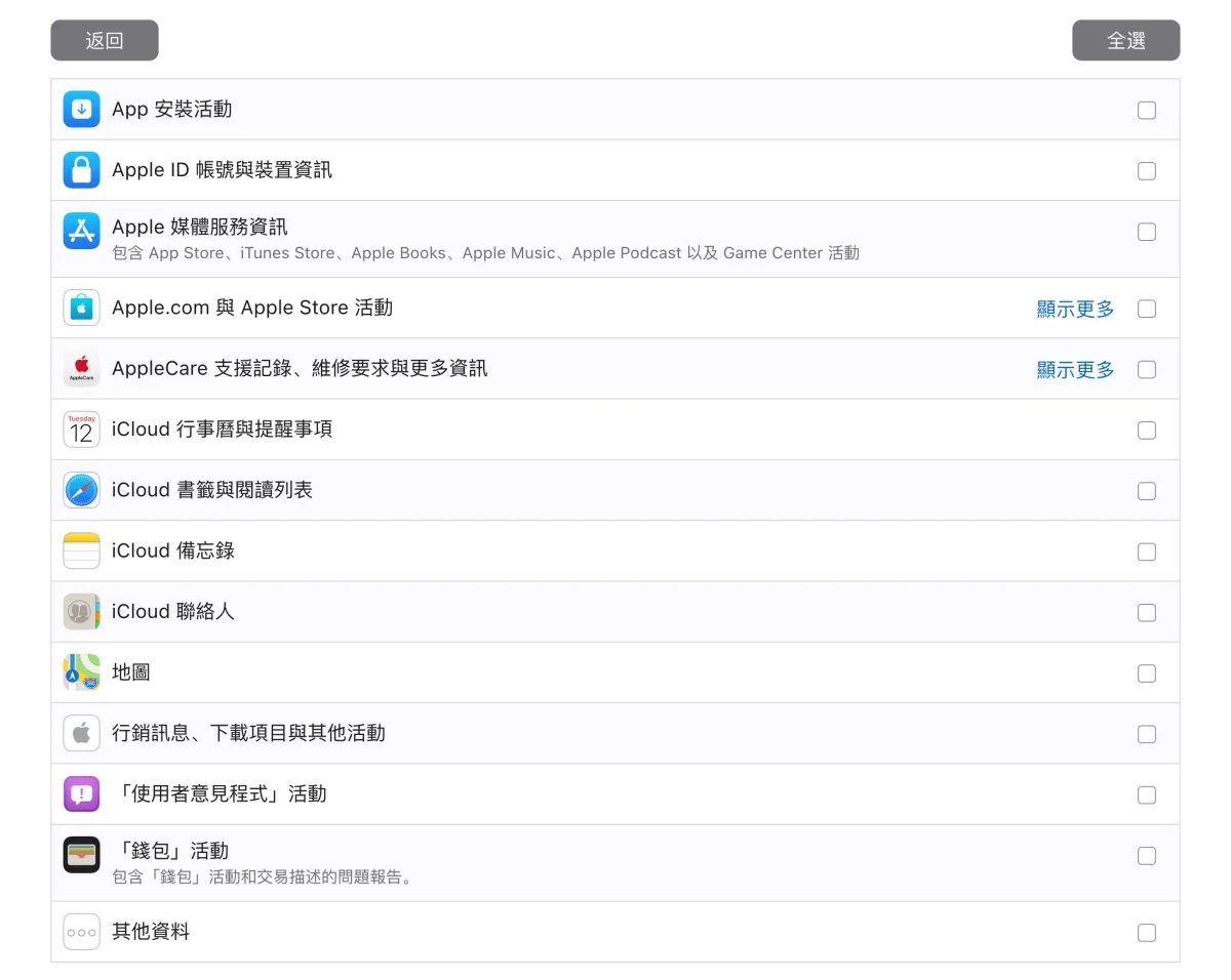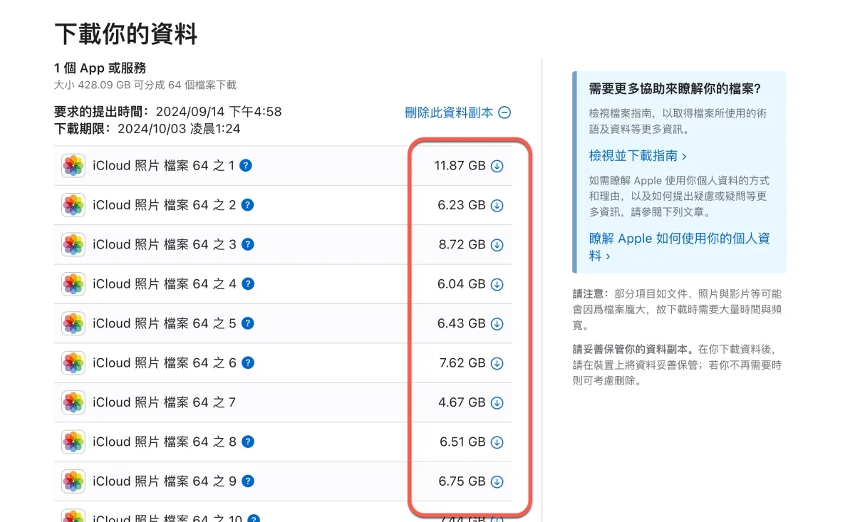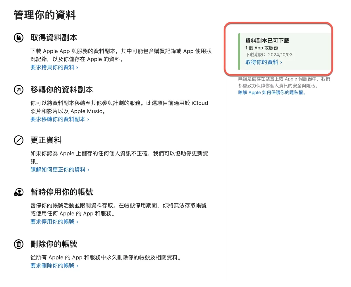這邊就可以下載各種資料,其中包括在 iCloud 中的各種資料、資訊,還有你 Apple ID 下的各種內容。