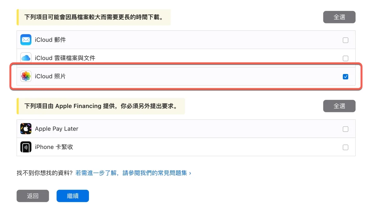 其中有一個項目就是 iCloud 照片,以及 iCloud 雲碟的檔案,這二個是大家最需要備份的,勾選後繼續。