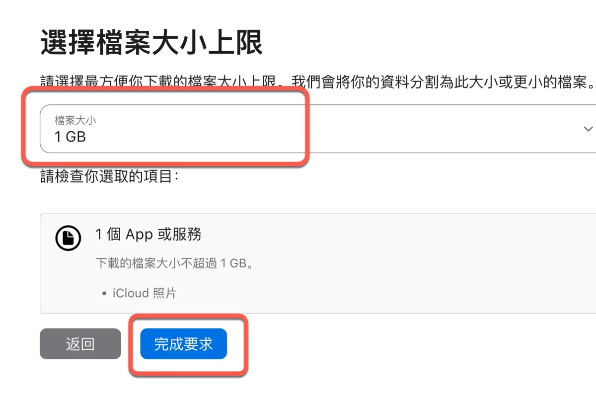 如果你下載的內容檔案真的很大,建議切分一下檔案大小,然後按下完成要求,完成後不會馬上可以下載,Apple 會再寄送通知你檔案準備好,大概等幾天就有了。