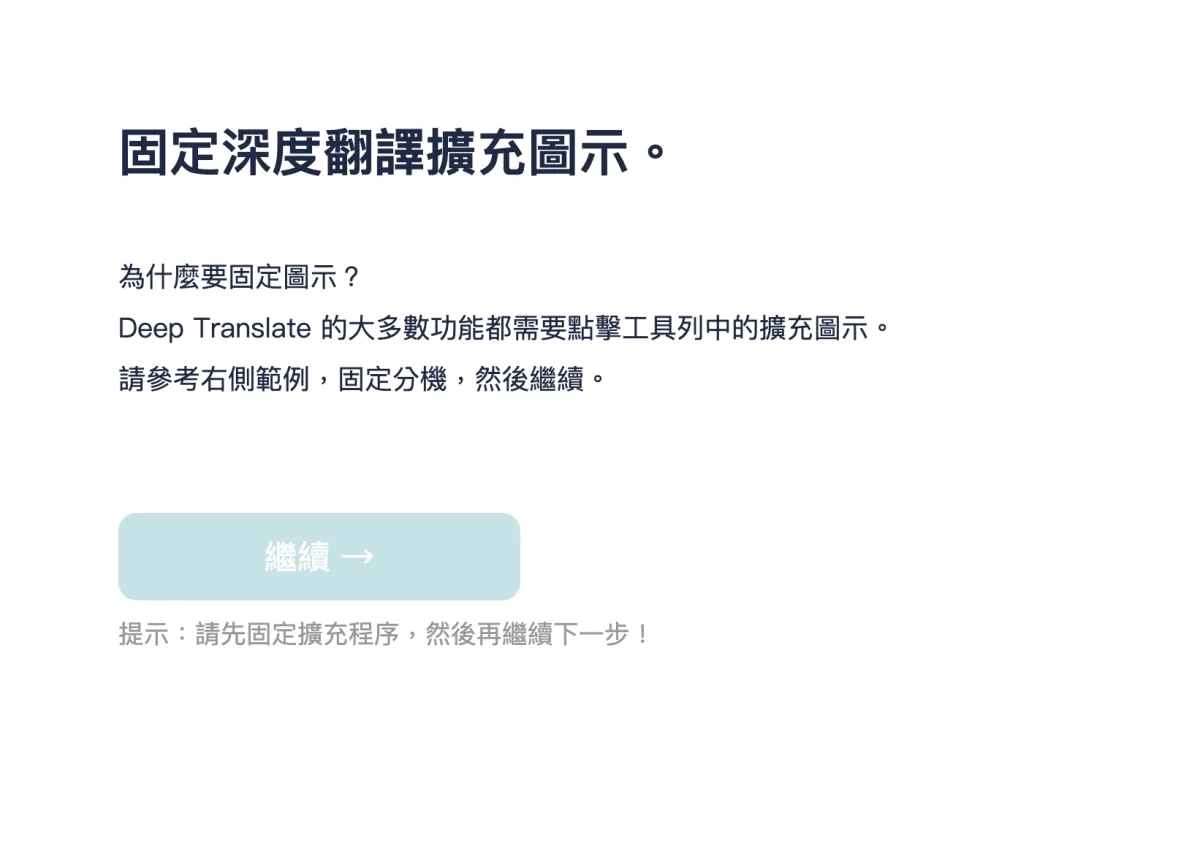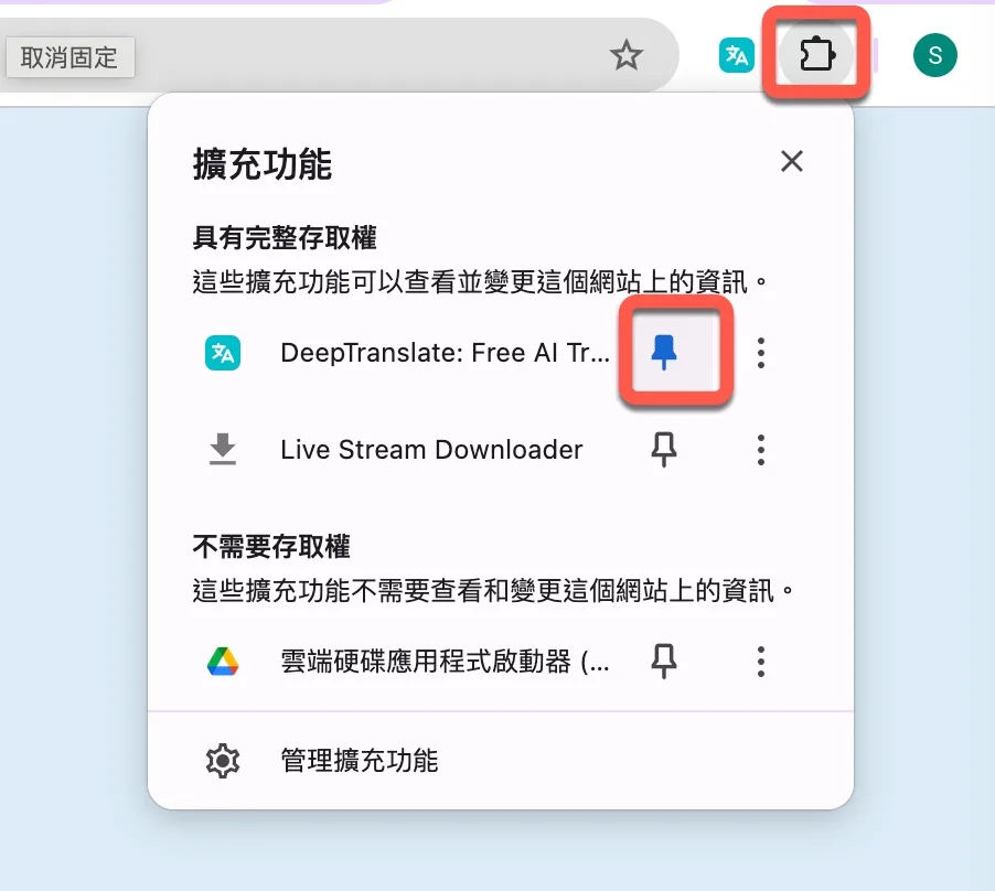 就是右上角點擊應用程式的圖示後,將 DeepTranslate 釘選,就會固定顯示在外面,不用每次都點進來。