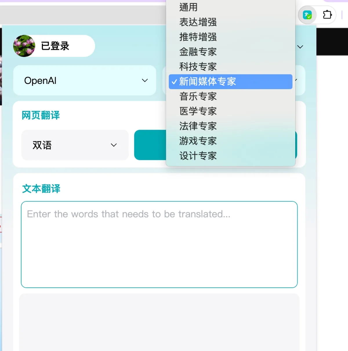 比如我用 CNN 新聞網站測試,可以選擇 OpenAI 後再選擇想要翻的類別,可以讓內容翻譯的更加精準,我選了新聞媒體專家。