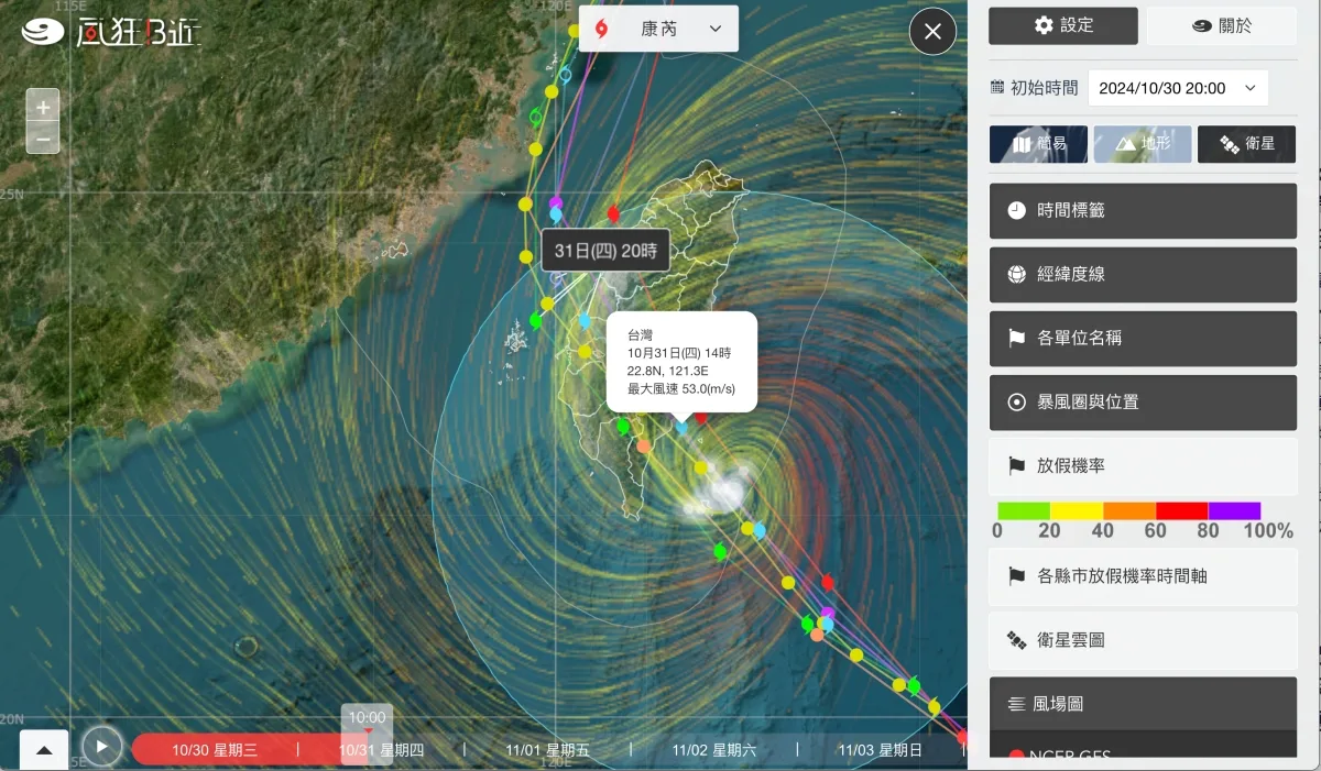 最有趣的是還有各縣市放假機率時間軸,像這次穿心颱,基本上是 100% 沒錯啦,也真的都全放了。