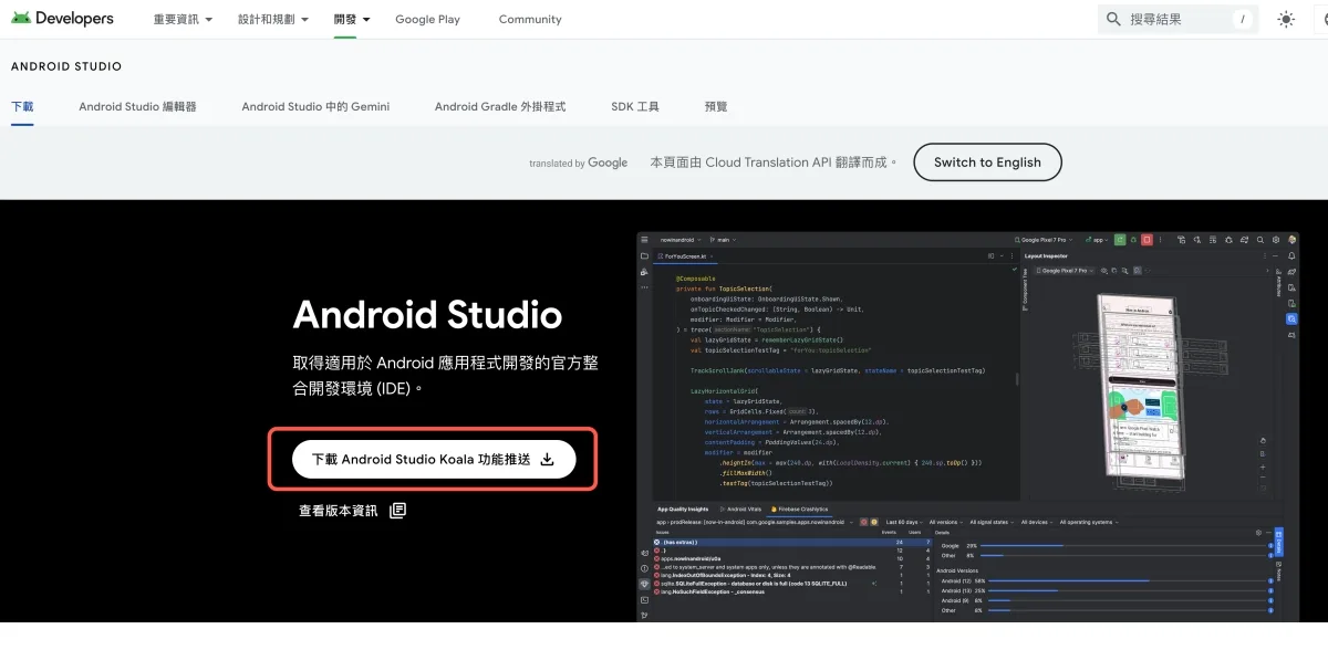 可以接受或想要試看看的,先進到網站點擊下載 Android Studio Koala 功能推送。