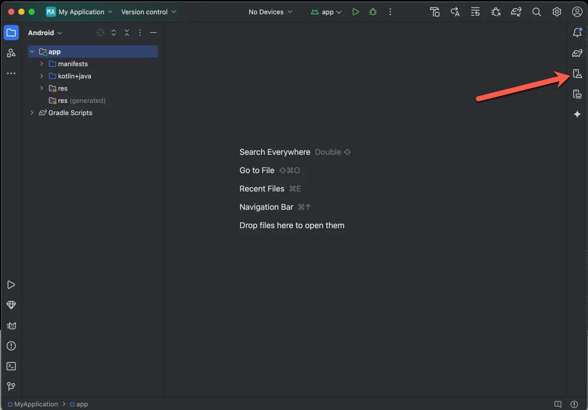 安裝完後直接執行,這畫面看不懂沒有關係,這本來就是搭配開發 App 一起的軟體,我們只是要用到其中的 Android 模擬器,點擊右邊紅箭頭指的圖示。