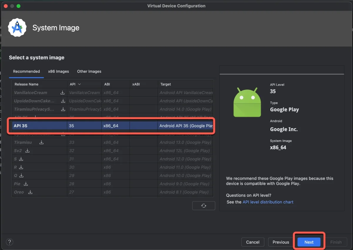 如果你是選擇上面本來就有的設備列表,進到這裡時會直接有一個已經下載的預設系統映像檔,這是已經包含 Google Play 的,下載其它的可能會不包括,要注意 Target 裡後面的刮號。