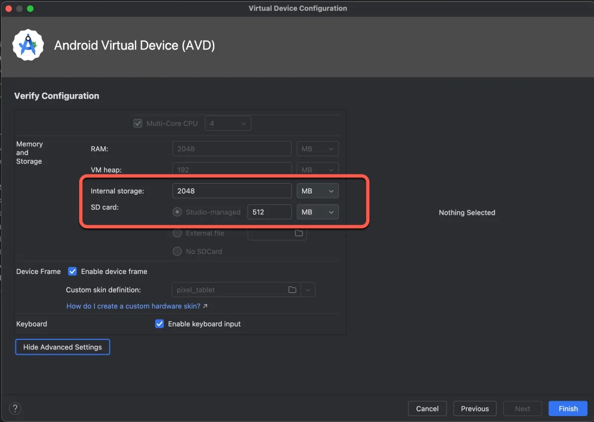 如果你是選擇預設的設備列表,這邊就只能修改儲存空間跟 SD card 容量,如果是自定新增一個硬體就可以修改,不過自訂硬體的問題是沒有直接內建 Play Store 的映像檔,會比較麻煩一點。