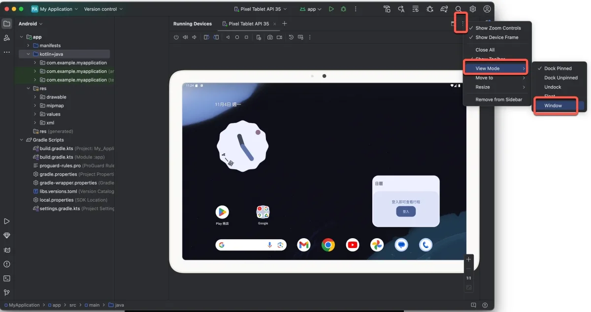 如果你不想要連戴整個軟體框框一起顯示,只想要模擬器為主的畫面,在上方的三個點那裡,下拉 View Mode 再選擇 Window 就可以了。