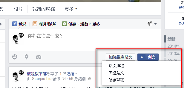從下拉選單中可以看到變成三種分別是貼文排程、回溯貼文及儲存草稿,往下我們來看看差異吧。