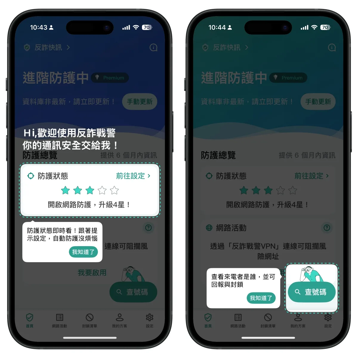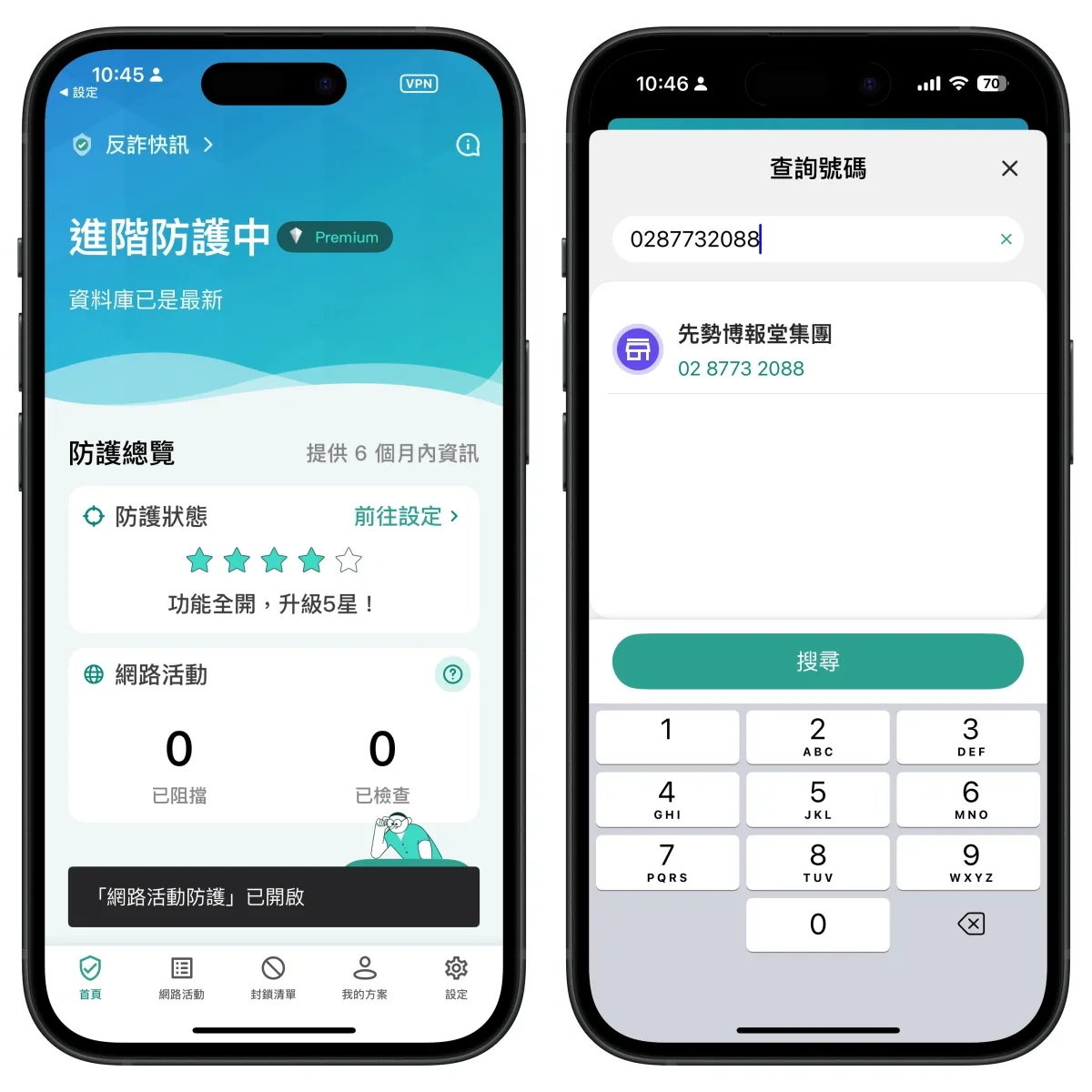 除了來電辨識外,還有網路活動防護,可以幫你阻擋掉高風險的網頁,避免被詐騙,除了電話外,還多了這功能真的不錯。