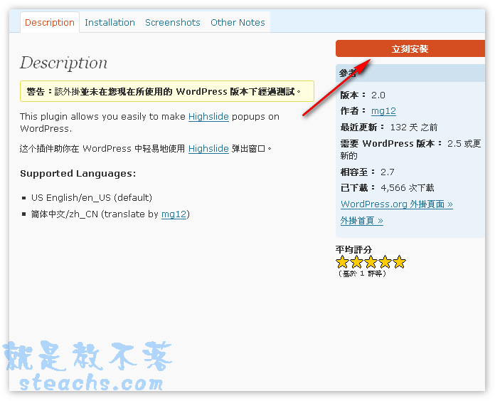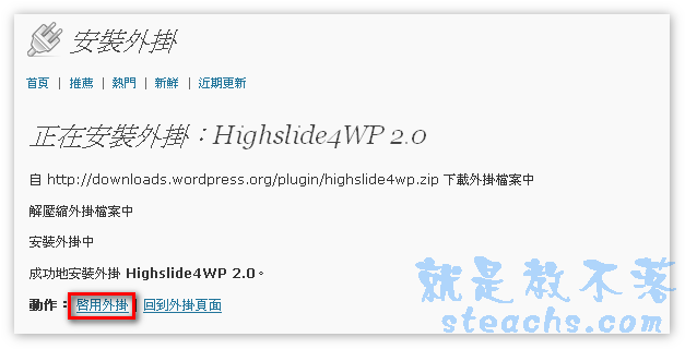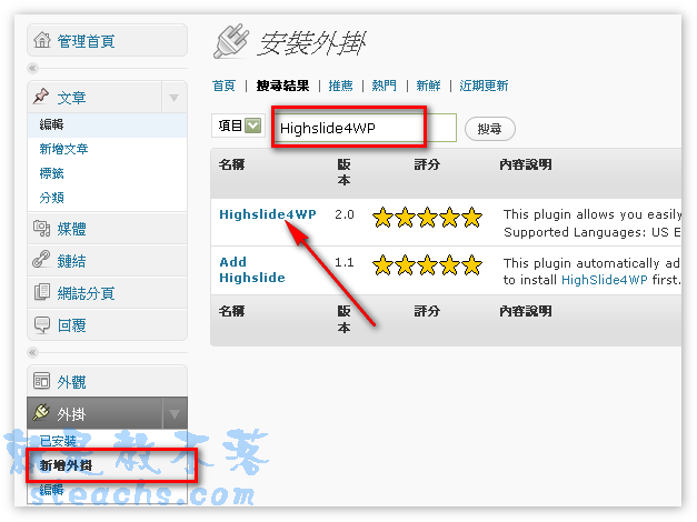 或利用後台安裝 外掛→新增外掛→輸入Highslide4WP搜尋 ,點擊Highslide4WP安裝