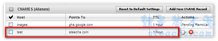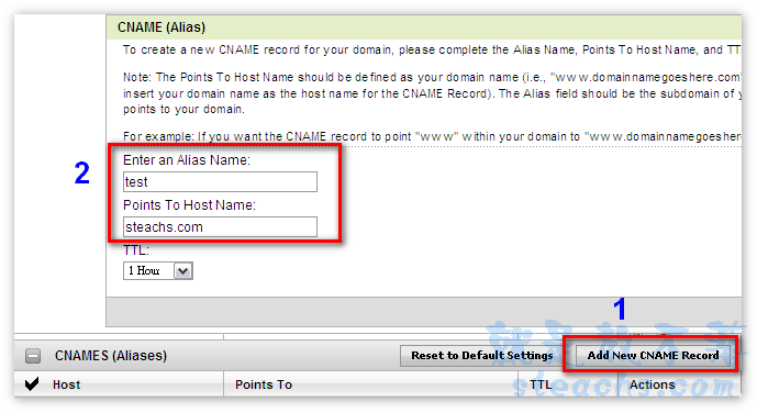 設一個叫做test.steachs.com的子域名,就在Alias Name輸入test、Host Name輸入steachs.com