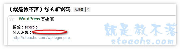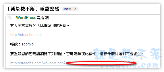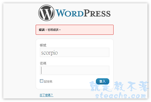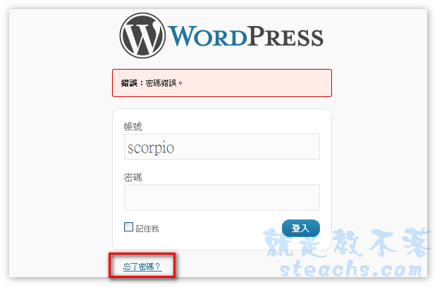〝忘記密碼〞或是直接輸入網址 http://你的網址/wp-login.php?action=lostpassword,此方法是適用於輕度失憶的人用的,指還記得帳號和Email的人