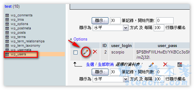點擊wp_users資料表,在你的帳號點擊編輯(紅圈處)