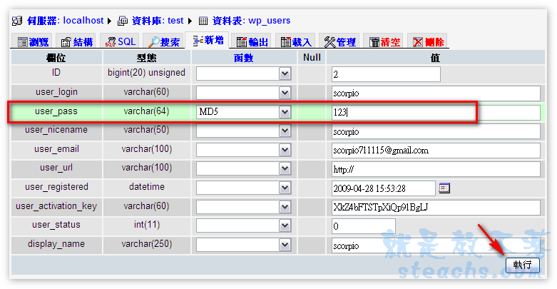 在user_pass那一行,函數選擇MD5,值再輸入你要的新密碼,按下執行即更改完成!