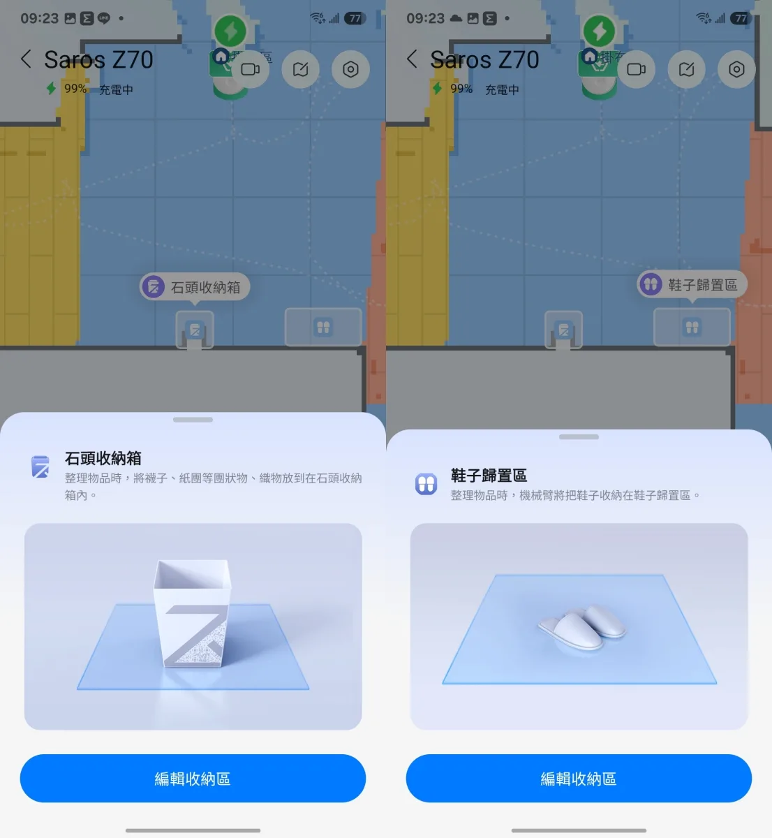 那麼你一定很好奇,這拖鞋、襪子或是紙巾等,夾了之後會去哪裡?只要預先在地圖編輯功能裡,設定好石頭收納箱的位置以及鞋子歸置區,這麼一來除了拖鞋以外的物品都會夾到收納箱去放,拖鞋則是都會整理到鞋子歸置區。