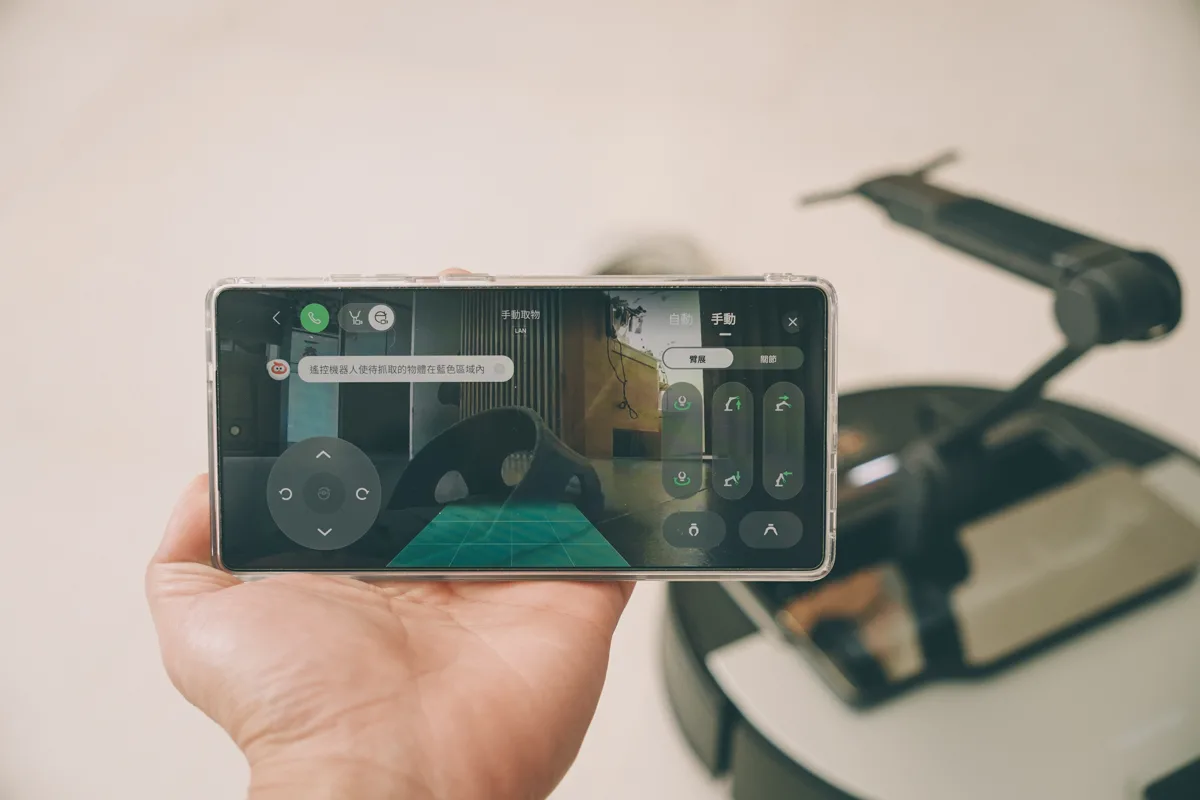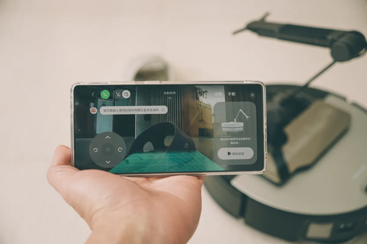 最有趣的是,除了平常清掃自動辨識去夾取之外,也可以透過手機 App 手動遙控來操作,而這個操作也有分自動跟手動,自動的話基本上只要物品是支援辨識的,按一下就可以自動夾起來。