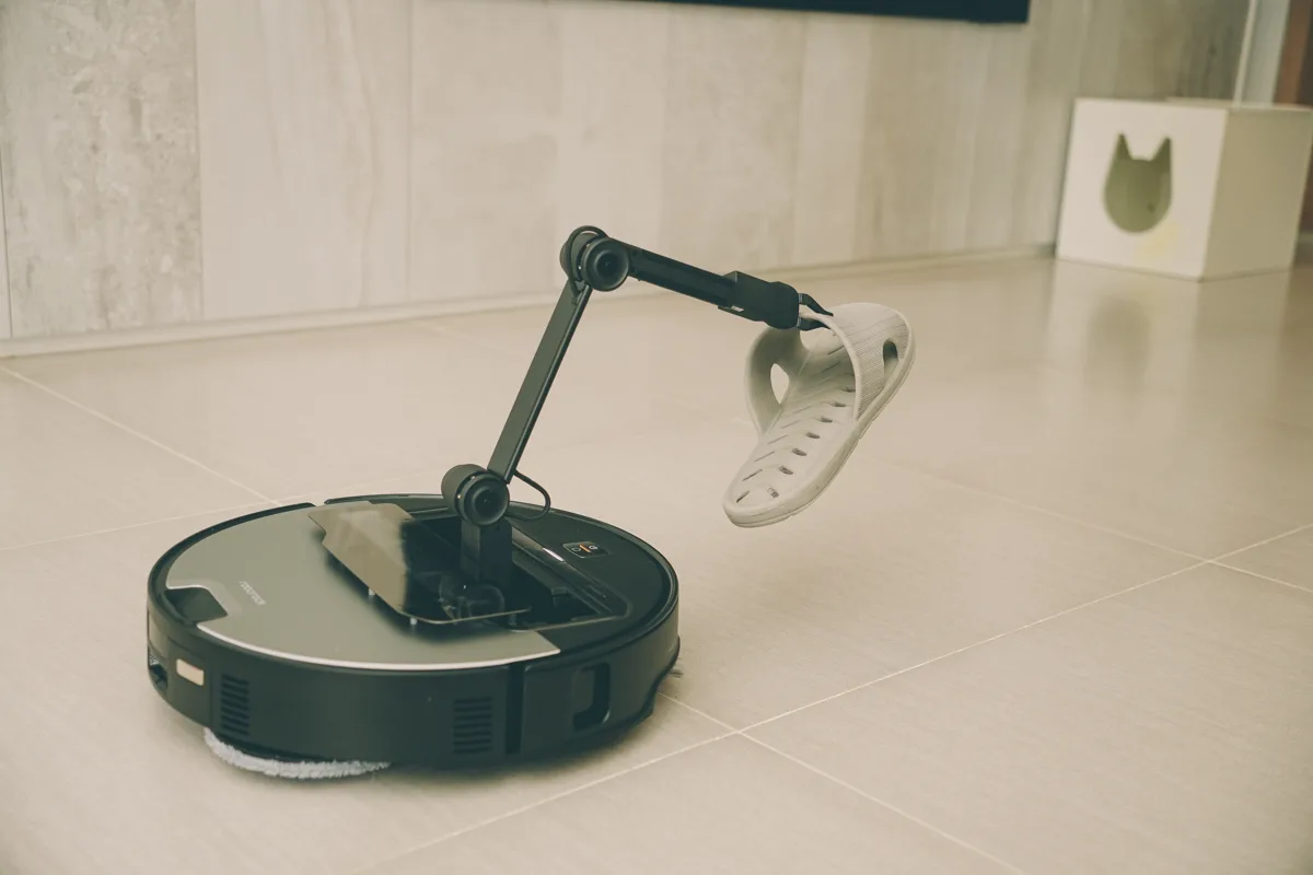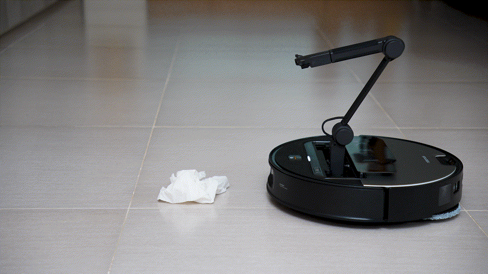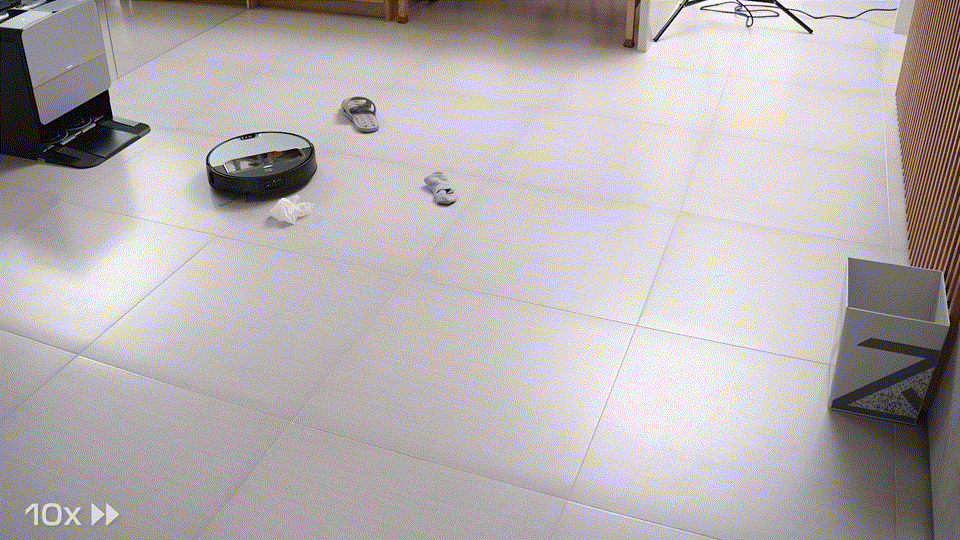 以拖鞋來說,他一定會夾取一定的角度跟位置,這就是靠 StarSight 先辨識後,再搭配夾子前方的鏡頭更精準的調整到需要的位置再夾取,真的蠻厲害的,以往有拖鞋的地方會繞過去,現在可以先夾走再清掃,而且還能歸位到指定的區域,既是清潔又是整理。