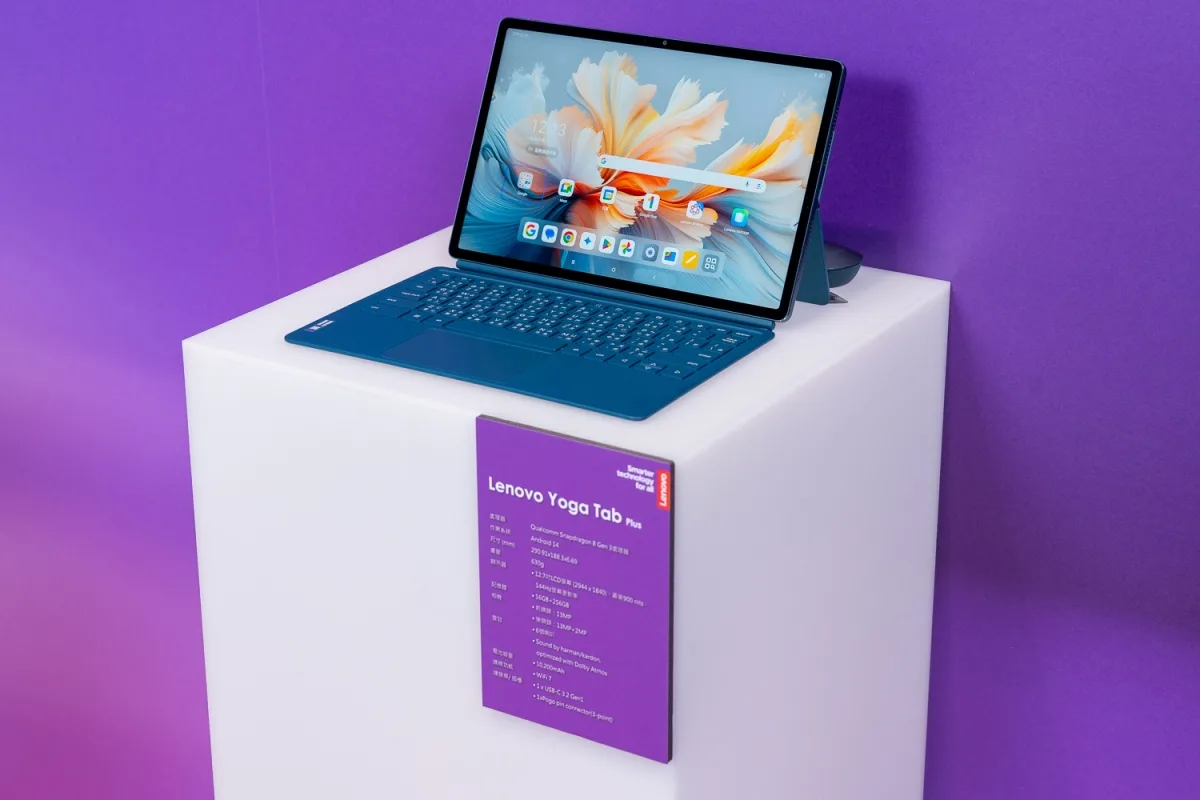 Yoga Tab Plus:搭載 Qualcomm Snapdragon 8 Gen 3,具備 20TOPS AI 運算能力,支援 Lenovo AI Note(靈感筆記)、AI Transcript(語音轉錄與翻譯)。