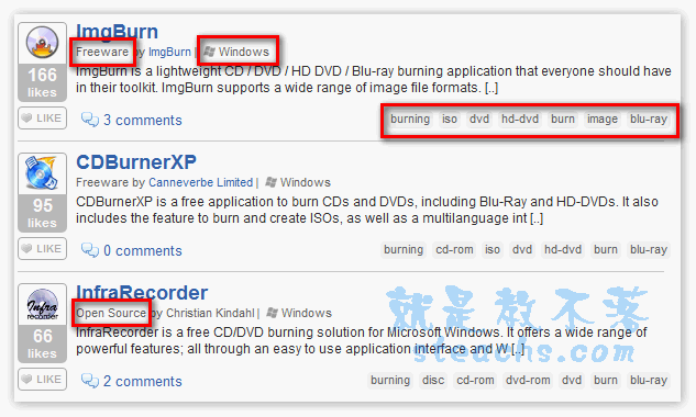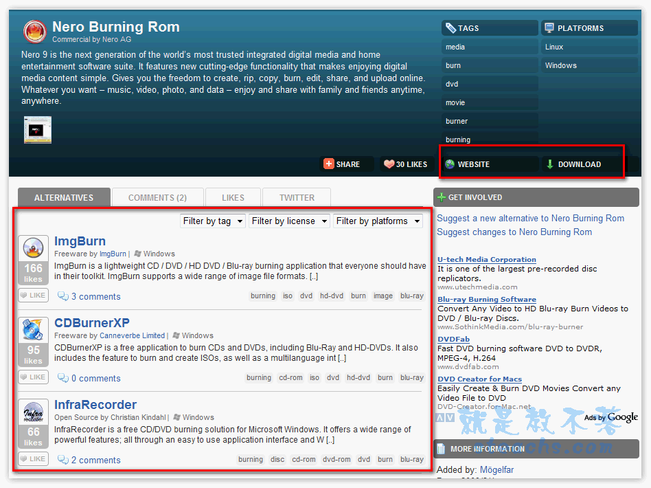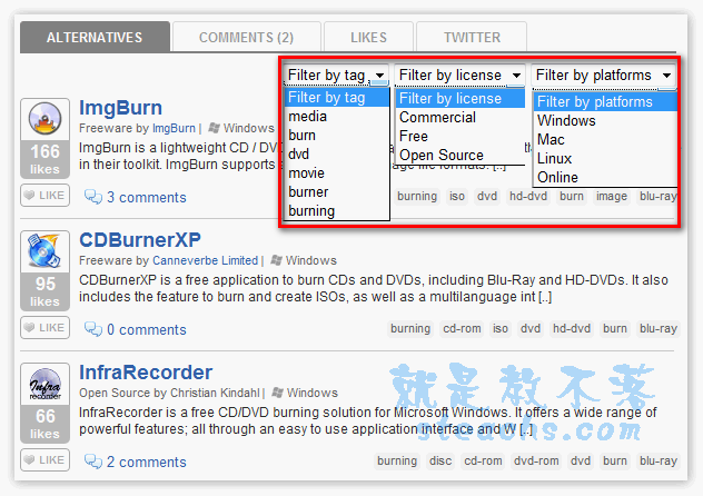 下方就有出現了丫湯前陣子才介紹過也不錯用的〝InfraRecoder〞,而在下方的替代軟體不一定只會出現免費的哦,不過我們可以藉由他所提供的篩選功能再更進一步的來更符合我們的需求。