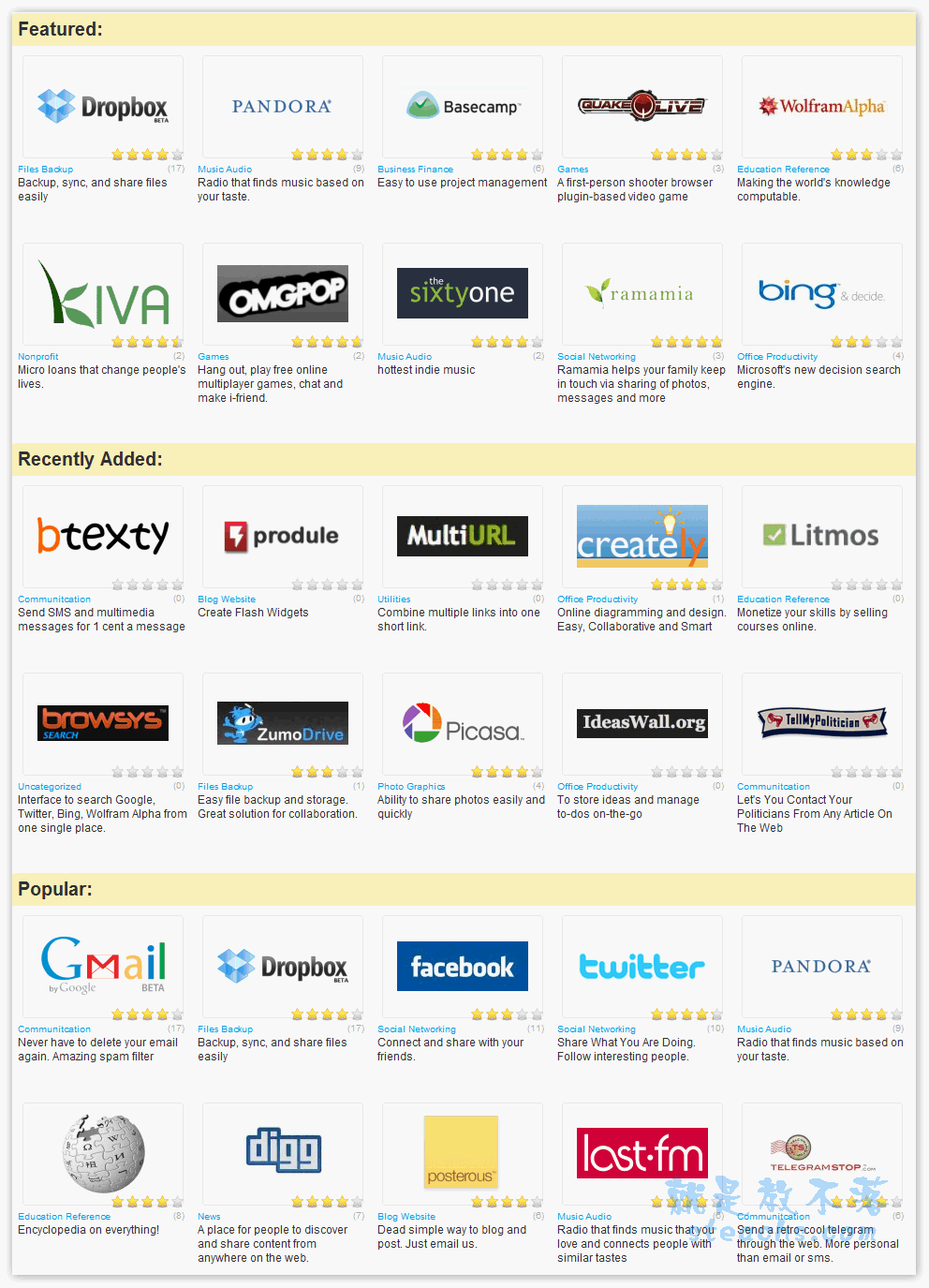 網站簡介:收集大大小小的應用服務站,不只有工具,部落格,檔案類的都有這網站在排列和分類上算蠻清楚,可能是成立不久,還沒把分類的部份弄的更整齊
