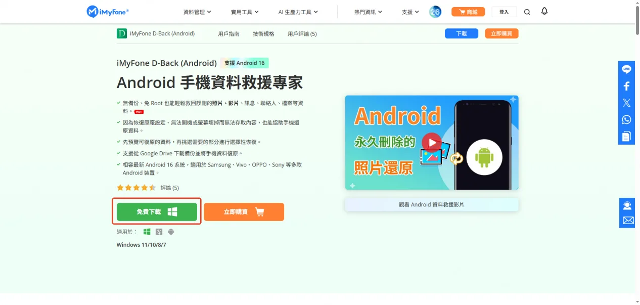 如果你想要最快速、成功率最高的方式,推薦使用 iMyFone D-Back for Android 這款專業的 Android 資料救援軟體。它不需要你有太多技術背景,就能幫你從手機內部儲存空間、SD 卡或