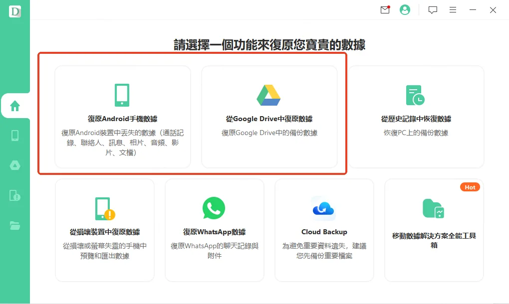 在軟體介面中選擇「復原 Android 手機數據」或「從 Google Drive 復原數據」,視你的需求而定。