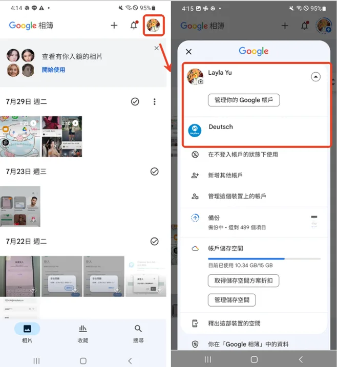 Google 相簿 App,點選右上角帳號頭像 → 選擇正確的 Google 帳號。