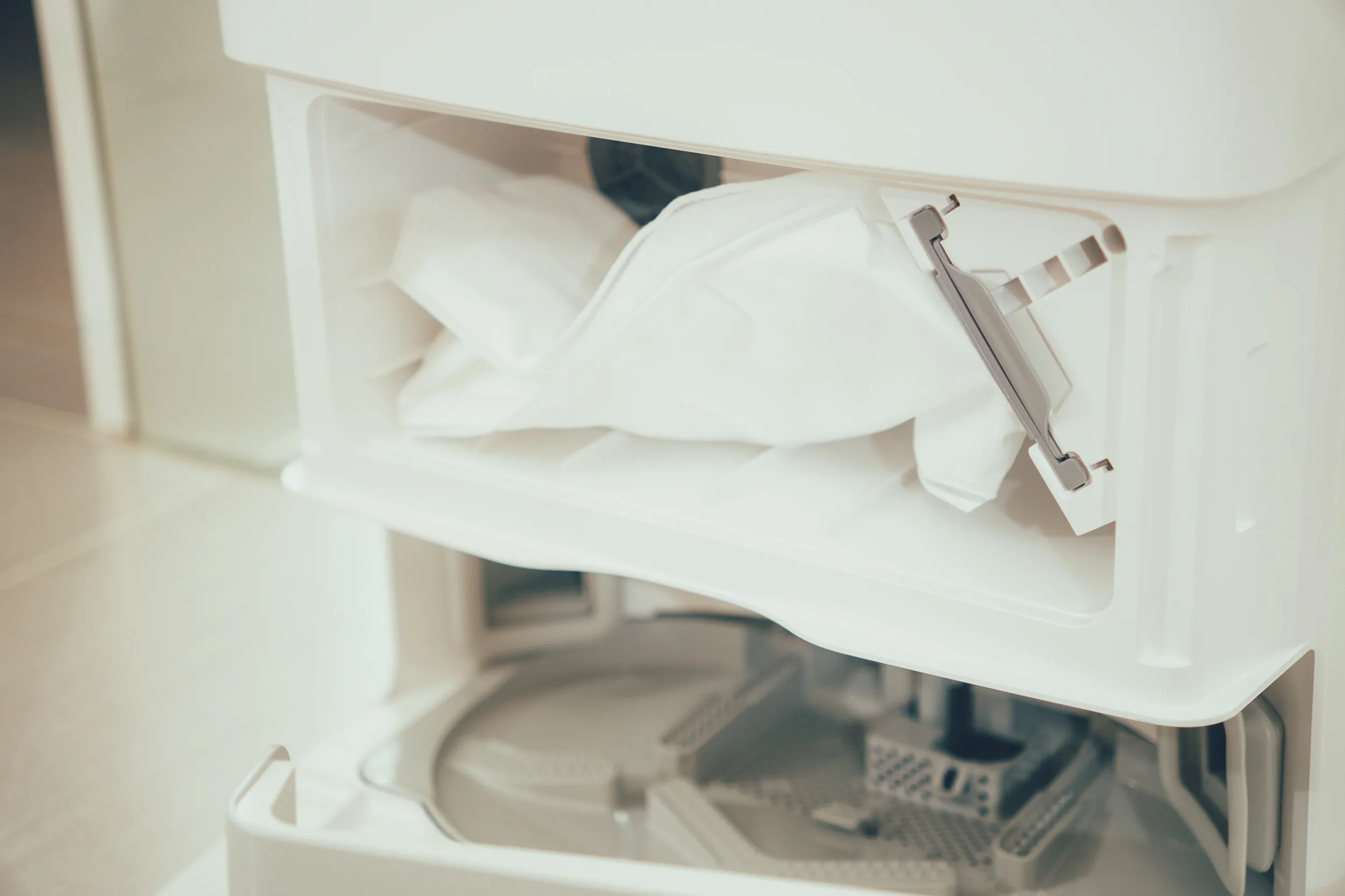 首先是「自動集塵」功能。每次清掃完畢後,機器人會自動回到基座,基座會啟動強力吸塵功能,將機器人集塵盒中的垃圾全部吸入基座的大容量塵袋中。這個塵袋的容量相當大,一般家庭使用可以維持數週甚至一個月才需要更換,大大減少了維護頻率。
