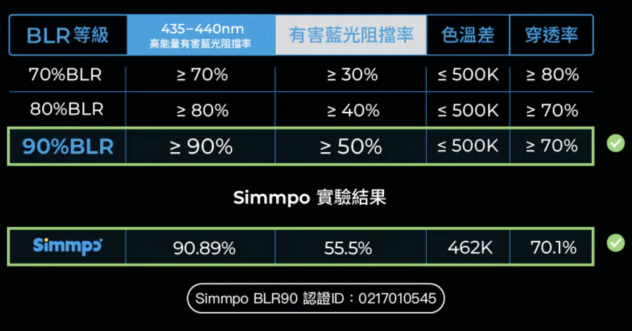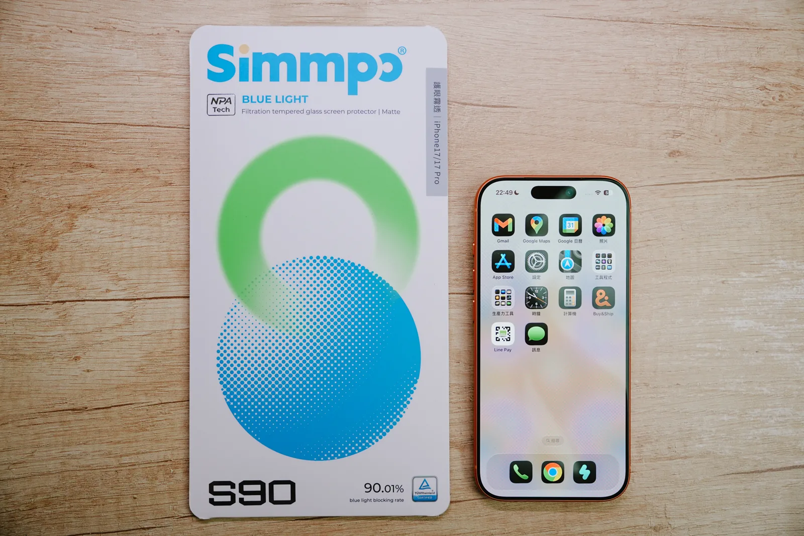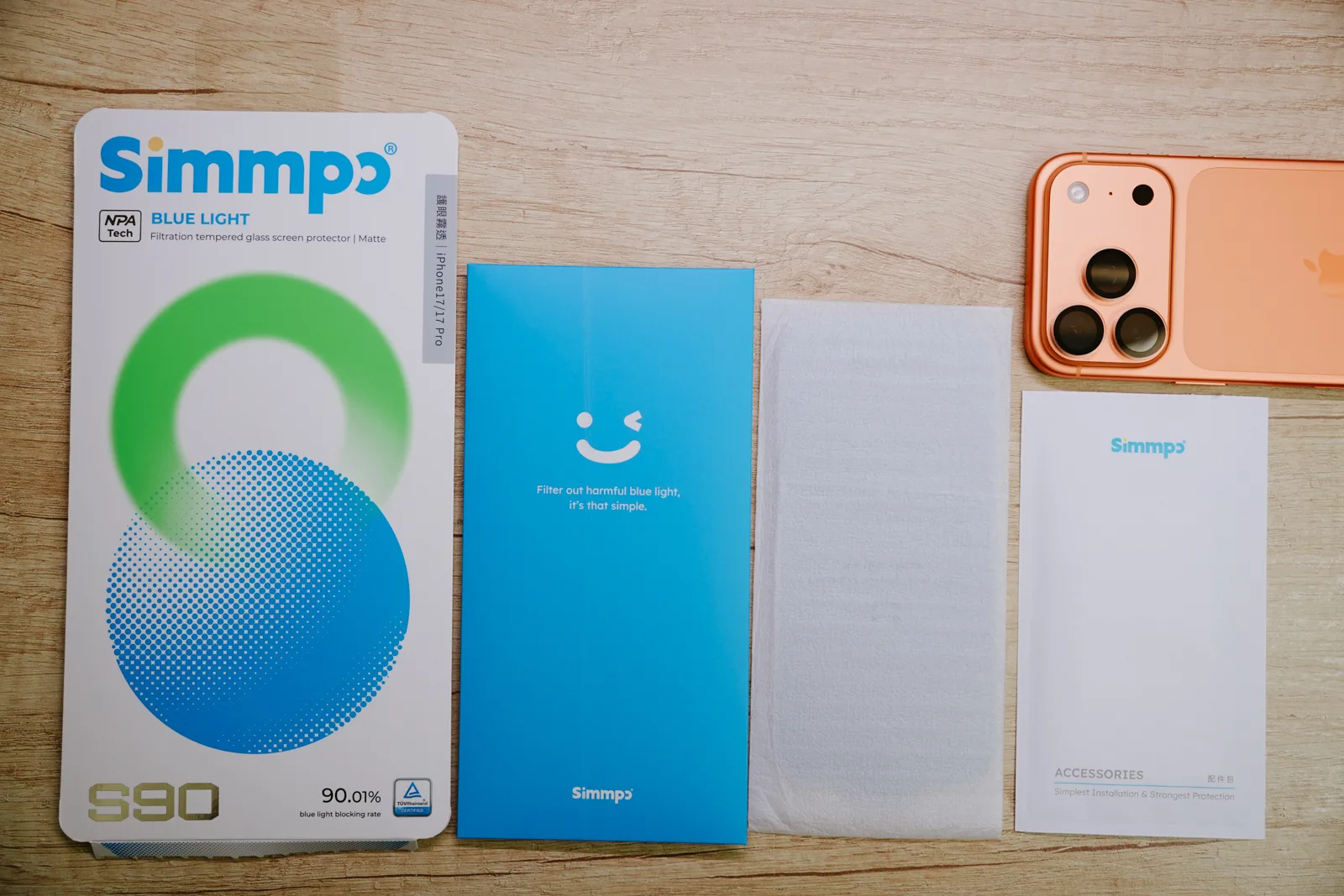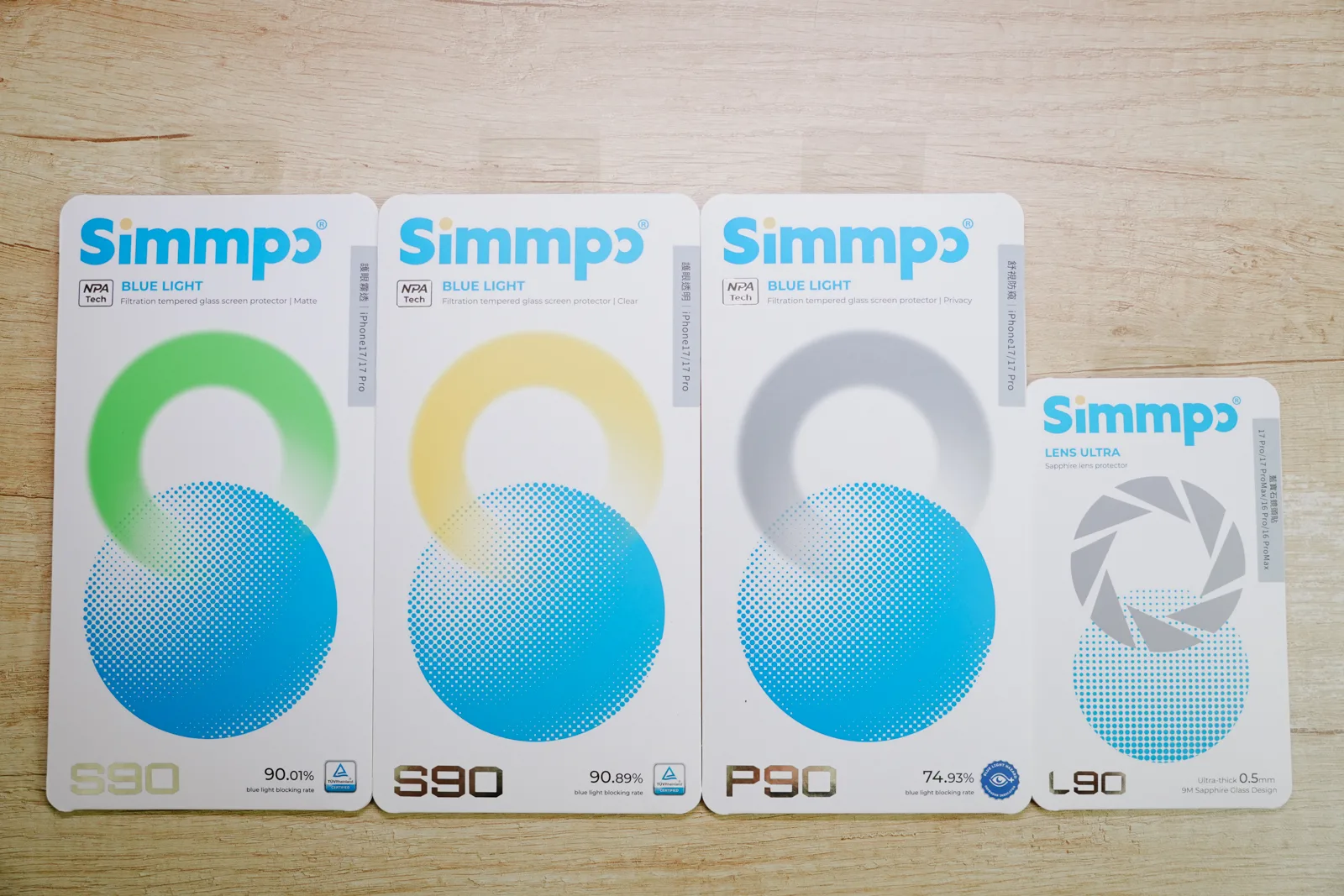 今年為了太座的 iPhone 17 Pro,預先選好要使用的保護貼是很重要的,而我們對於保護貼的需求,最重要的就是「抗藍光」,畢竟我們一個已年過 40,一個將近 40,對於眼睛的保護是很講究的,今年我們一樣用上了 Simmpo 的抗藍光護眼保護貼,只不過沒想到今年的 S-90 系列居然又大幅的突破去年的技術,獲得了德國萊因 90%BLR 的認證,真的太誇張,給大家看一下,90%BLR 是可以過濾 435-440mm 的高能量有害藍光 90%,一般的有害藍光阻擋率更是高達 50%,色溫差也小於 500K,等於是幾乎沒色差,跟大家分享一下,一般的抗藍光保護貼的阻擋率,一般最多就是看到 30~35% 左右,你就知道 Simmpo 這個 >50% 有多強了。