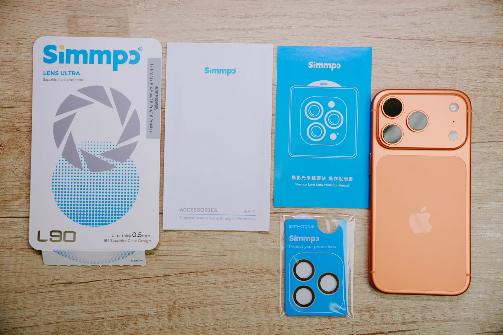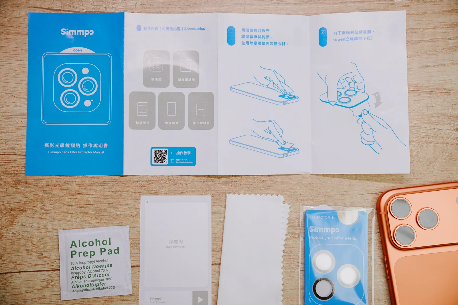 Simmpo 不論是螢幕保護貼或是鏡頭保護貼,畫面給的都很完善,有操作說明書、清潔組,而且保護貼不用自己一個個貼上去,有夠方便。