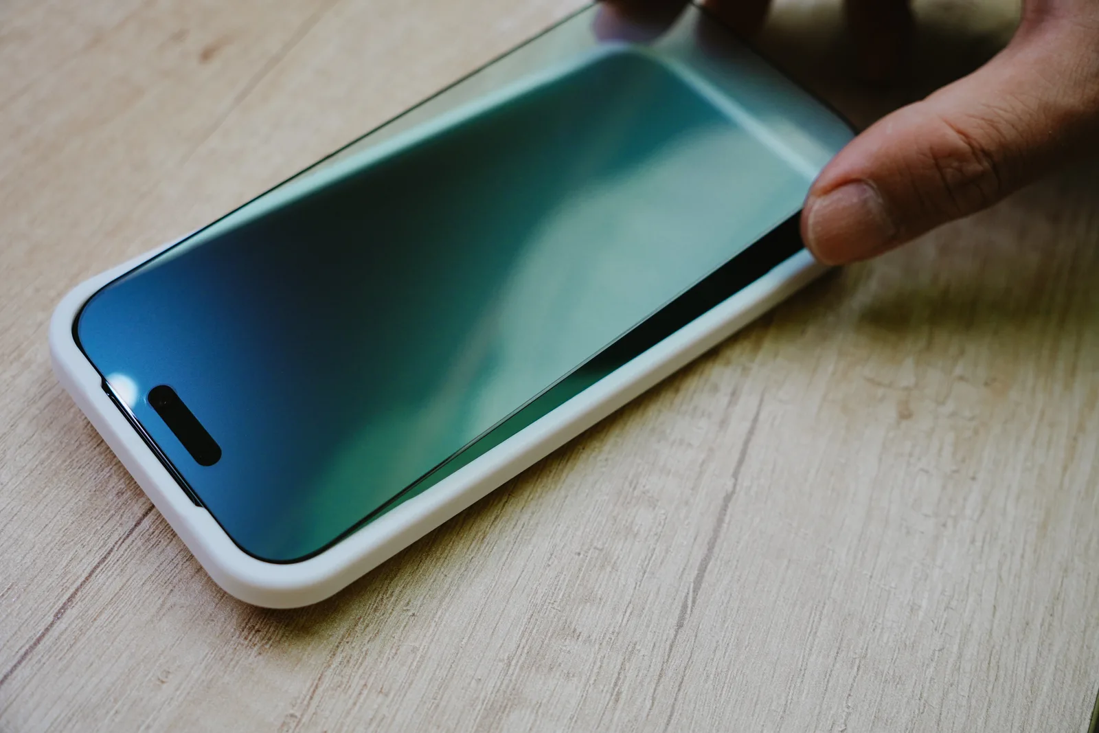 你會看到螢幕快速的擴散貼上去,我自己試下來最佳是你在放下去的時候 ,手指直接橫壓畫一條過去,會貼合的更快更不會有氣泡要去推開。