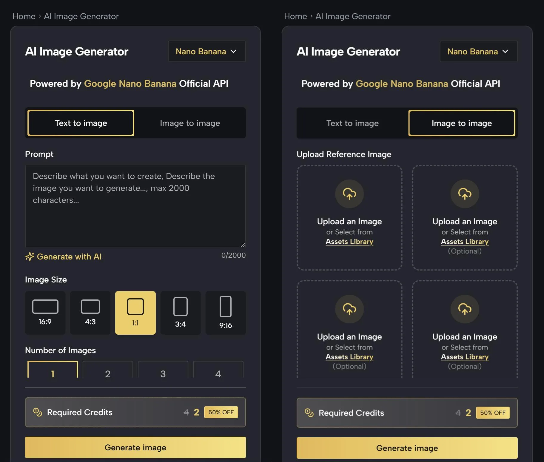 - 選擇模式:進入BananaImg AI,点击https://bananaimg.ai/image/,挑選【文字轉圖片】或【圖片轉圖片】