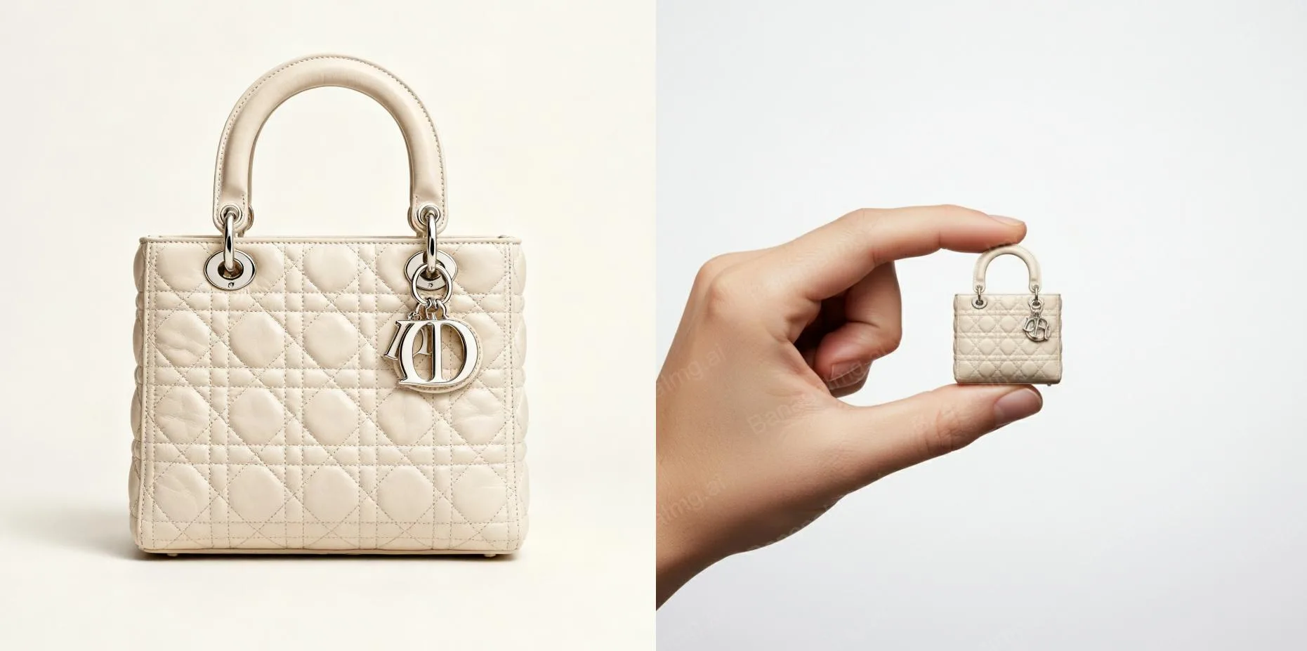 A high-resolution advertising photograph of a realistic, miniature product held delicately between a person's thumb and index finger. clean and white background, studio lighting, soft shadows. The hand is well-groomed, natural skin tone, and positioned to highlight the product's shape and details. The product appears extremely small but hyper-detailed and brand-accurate, centered in the frame with a shallow depth of field. Emulates luxury product photography and minimalist commercial style.