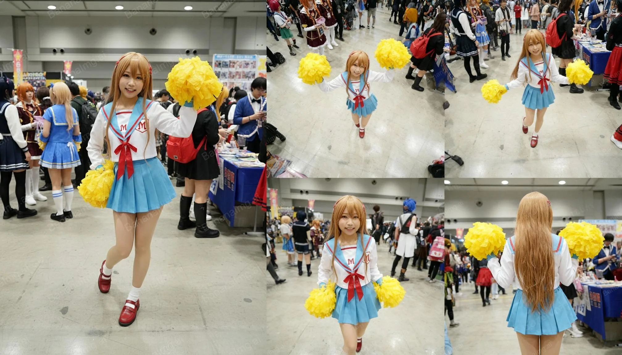 Generate a highly detailed photo of a [girl] cosplaying this illustration, at Comiket. Exactly replicate the same pose, body posture, hand gestures, facial expression, and camera framing as in the original illustration. Keep the same angle, perspective, and composition, without any deviation.
