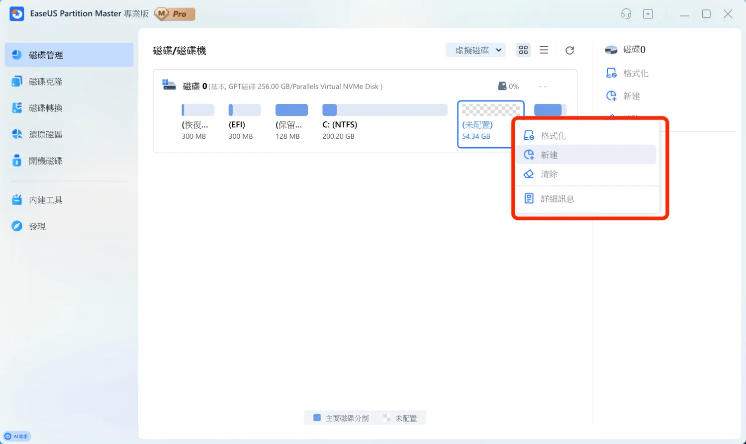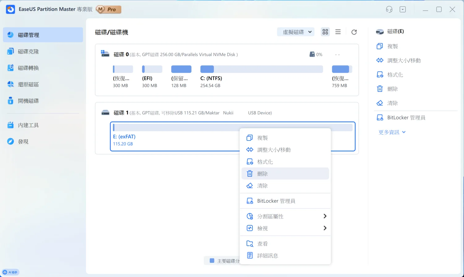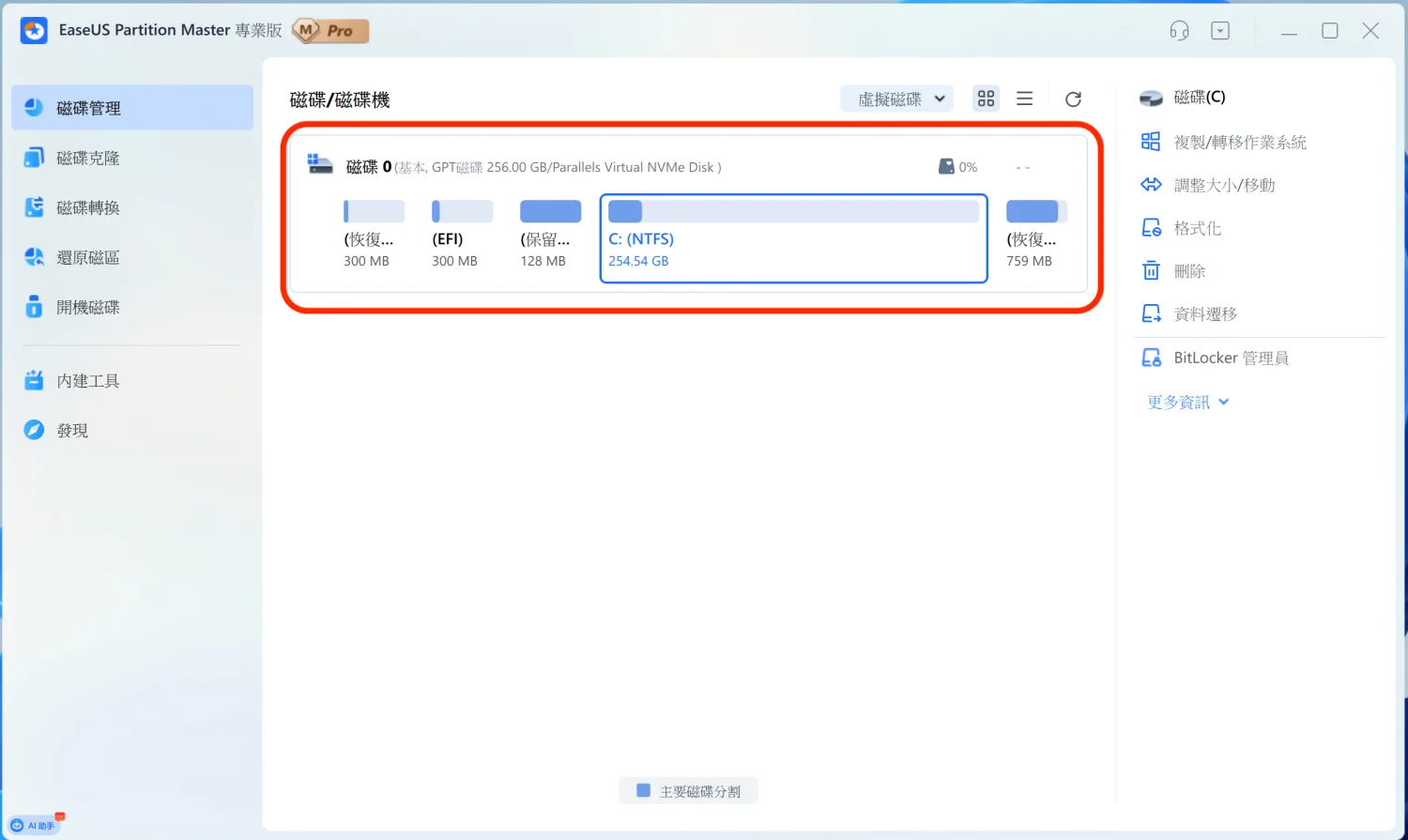 這個介面設計得很直覺,每個分割區都會標示檔案系統(NTFS、FAT32 等)和容量。像圖中這顆 256GB 的硬碟,就清楚顯示了 EFI 系統分區、C 槽主分區,還有恢復分區的配置。選中任何一個分割區,右側就會列出所有可執行的操作。在分割區上按右鍵,會跳出更完整的功能選單。除了基本的調整大小、格式化、刪除,還有合併分割區、分割空間、延伸壓縮等進階功能。這些操作在 Windows 內建工具裡很多都做不到,或是要冒著資料遺失的風險。