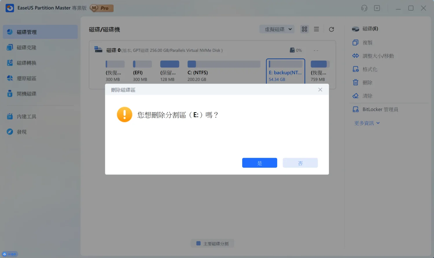 如果後來發現某個分割區用不到,也可以輕鬆刪除。在要刪除的分割區上按右鍵,選「刪除」。軟體會再次確認,避免誤刪重要資料。刪除後,這塊空間就會變回未配置狀態,可以合併到其他分割區,或是重新規劃使用。